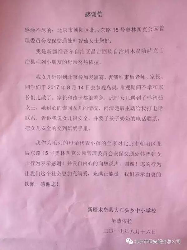 原來(lái),努熱依拉女士的女兒毛列8月14日在鳥(niǎo)巢游玩期間與家長(cháng)走散,找不到親人的小女孩遇到了正在執勤的韓智茹,她積極幫助孩子聯(lián)系到家人,并一直將孩子送到一公里外的科技館,交給孩子的奶奶。