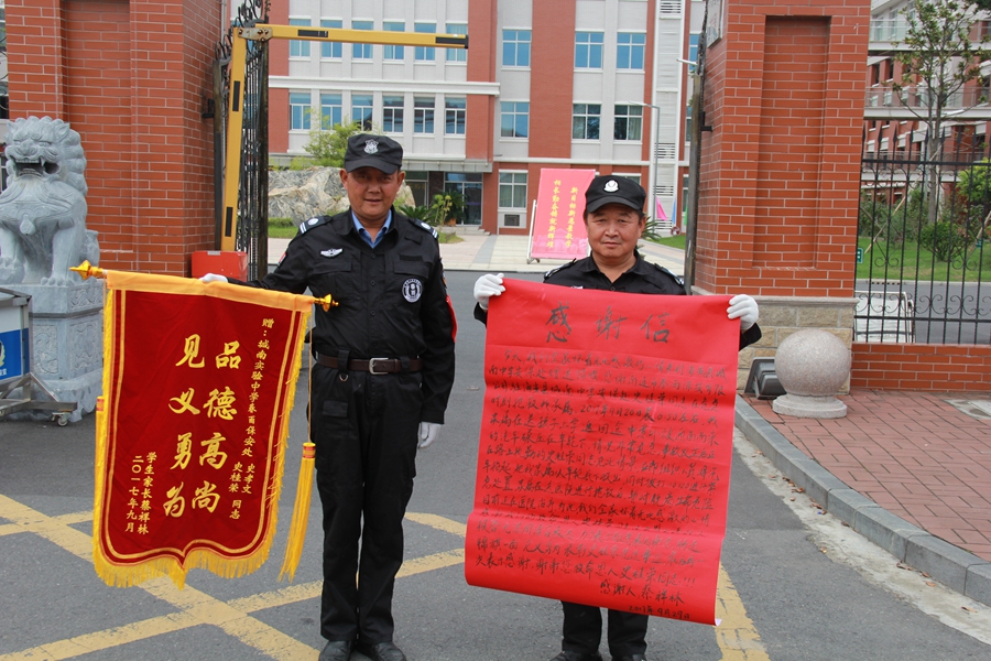 9月29日,家住城東鎮銀杏花苑的張榮蘭家屬特地將一面寫(xiě)有“品德高尚,見(jiàn)義勇為”的錦旗及一封感謝信送到了城南實(shí)驗中學(xué)安保處,表?yè)P南通春雨保安有限公司駐校保安史桂榮同志挺身而出、勇救受傷路人的事跡。