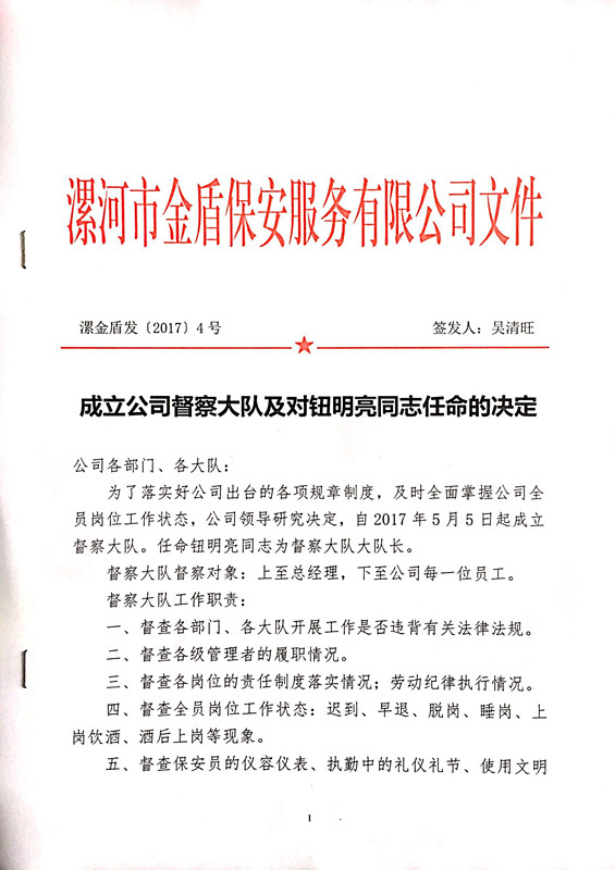 公司成立督查大隊及對鈕明亮同志任命的決定