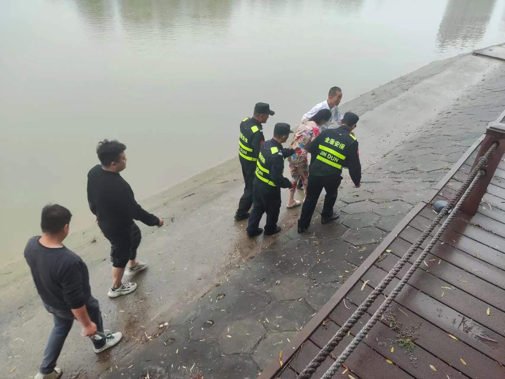 2023年10月19日下午,漯河市金盾保安服務(wù)有限公司沙澧河風(fēng)景區安保人員巡邏至荷花大道河邊時(shí),突然聽(tīng)到有人呼救,循聲望去只見(jiàn)一名二十多歲的女孩正在河水中掙扎。我公司安保人員立即用對講機呼叫支援,并從河岸邊取下救生圈、救生繩等設備趕往現場(chǎng)。與此同時(shí),接到呼叫支援請求的保安大隊長(cháng)陳金營(yíng)也火速趕到了現場(chǎng)指揮救援。經(jīng)過(guò)大家的共同努力,終于把女孩拉上了岸。冰冷的河水讓女孩凍得直打哆嗦,我公司安保人員將其帶回隊部并遞上熱水,這溫暖的一幕讓女孩感動(dòng)不已。